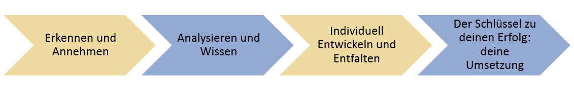 Ich, als Dein Bildungscoach, analysiere und identifiziere Dein Lernpotential. In vier aufeinander folgenden Entwicklungsschritten und Prozessphasen lösen wir Deine Stolpersteine auf und nehmen zusammen wahr, wo Deine Herausforderung beim Lernen liegt und was Dein Vorankommen stärkt.